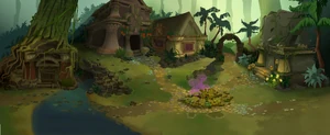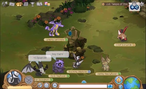 The Lost Temple of Zios was a night jungle environment. It had paths leading to Jamaa Township on the left side, Crystal Sands on the bottom right side, and Sarepia Woods on the top right side. The eye of the jungle featured a Monkey Statue with the Temple of Trivia game off to the correct at the base of an elephant statue. The statue was replaced by the statue of Zios, shortly afterward Beta Testing ended. On the far left side, in that location was a temple entrance that was boarded off side by side to a small stream. To the top right, there was another temple construction with a door leading to the Chamber of Noesis. Simply right of this doorway was a smaller structure that had covered windows and no doorways.