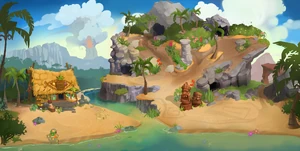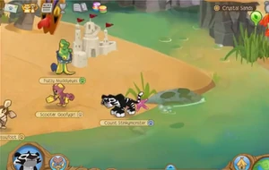 Crystal Sands was a sandy, tropical beach with thick jungle, sharp cliffs, and a volcano in the groundwork. On the left side was a big tiki-style house that had a large wooden pineapple sign forth the peak. Entering this house would pb to Captain Melville'southward Juice Hut. Just below the hut was the Overflow game along the shoreline and just to the right, in that location was a sand castle with a piffling red flag on the top. There was as well a totem statue in the background and tiger face-shaped caves, which may be a reference to Sir Gilbert, the tiger alpha, due to Crystal Sands being his guardian land. Crystal Sands kept this look until July 2011.